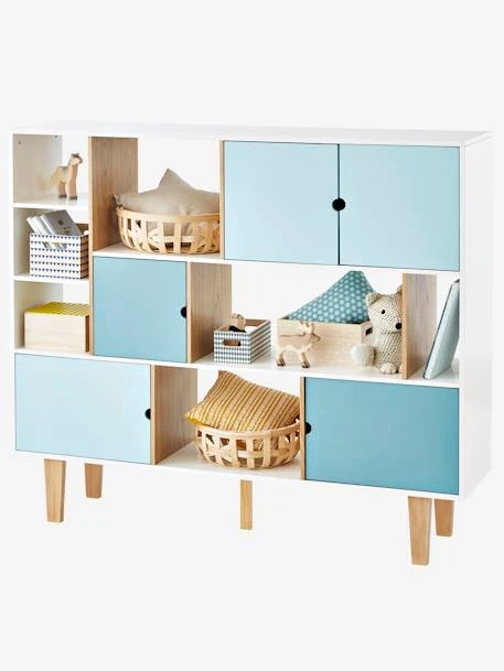 Un design inspiré des pays scandinaves et un camaieu de bleus tendres ; ce meuble de rangement a vraiment tout pour plaire ! D’un côté, la déco se montre grâce aux niches ouvertes, de l’autre, les petites affaires se cachent derrière les placards !
