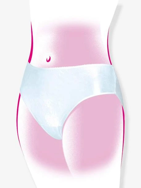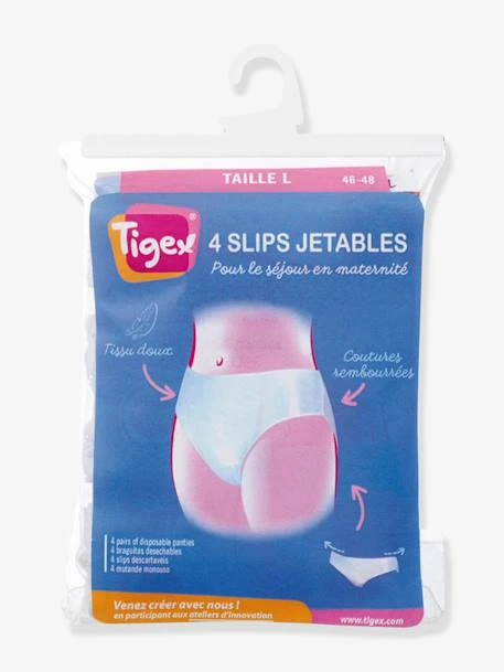 4 slips jetables Tigex, disponibles en taille S, M ou L, recommandés lors du séjour à la maternité pour maintenir les protections périodiques sans risquer de tâcher vos sous-vêtements habituels.