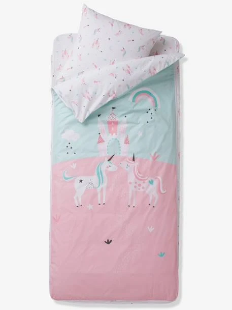 - Motifs licornes sur le devant de la housse de couette et imprimés petites licornes et étoiles sur la taie d’oreiller et le dos de la housse de couette.