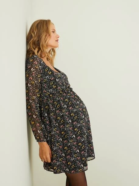 Délicatement volantée, la robe en crêpe imprimé vous accompagnera avec fantaisie et féminité tout au long de la grossesse… Et même après pour l’allaitement, grâce à son encolure boutonnée.